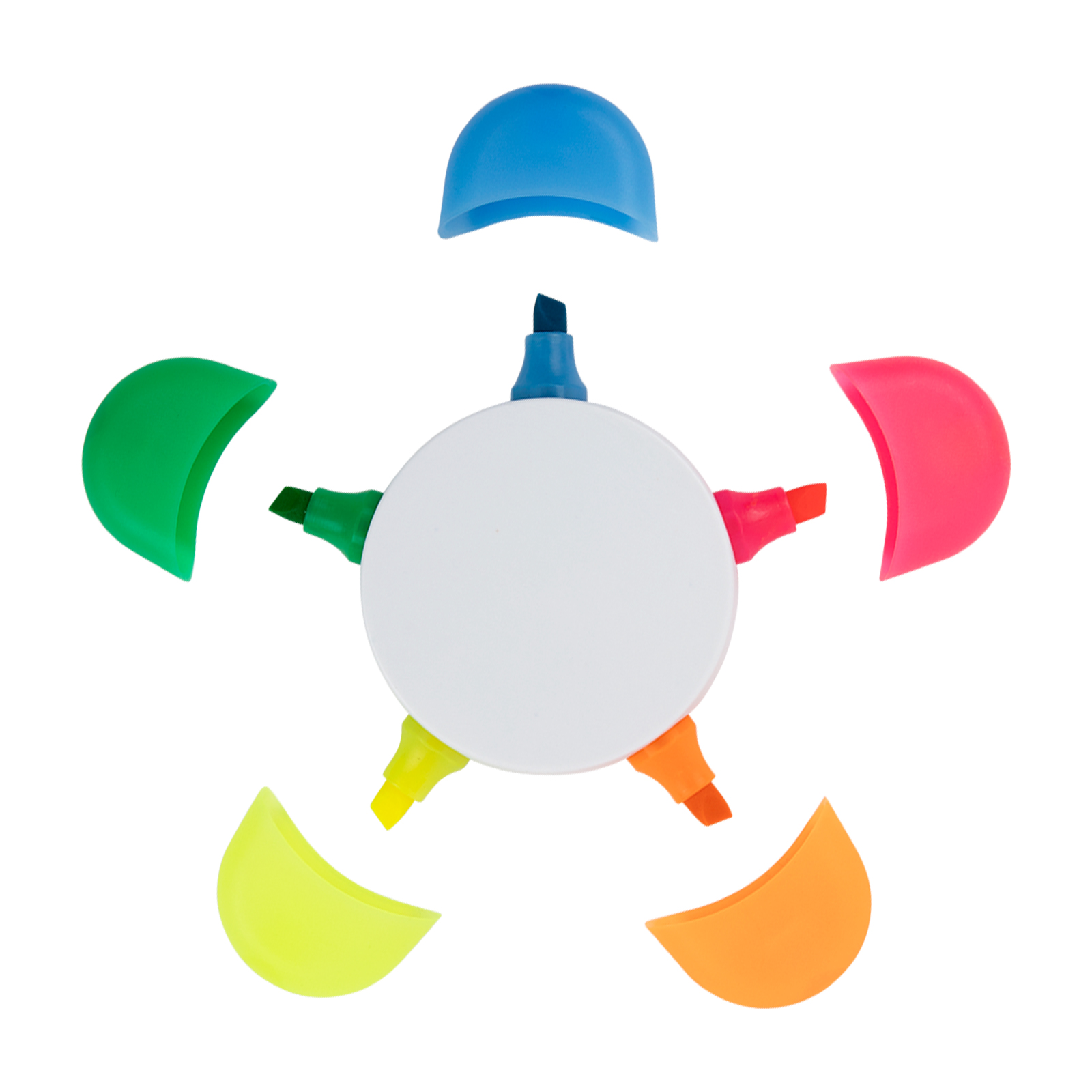 Introducing the Daisy Highlighter: a bright and colourful flower-shaped highlighter marker designed to keep all your highlights together. Features a white centre surrounded by chisel-shaped fluorescent highlight colours: Pink, Orange, Yellow, Green, and Blue, each with a matching cap. Portable and convenient for on-the-go use.