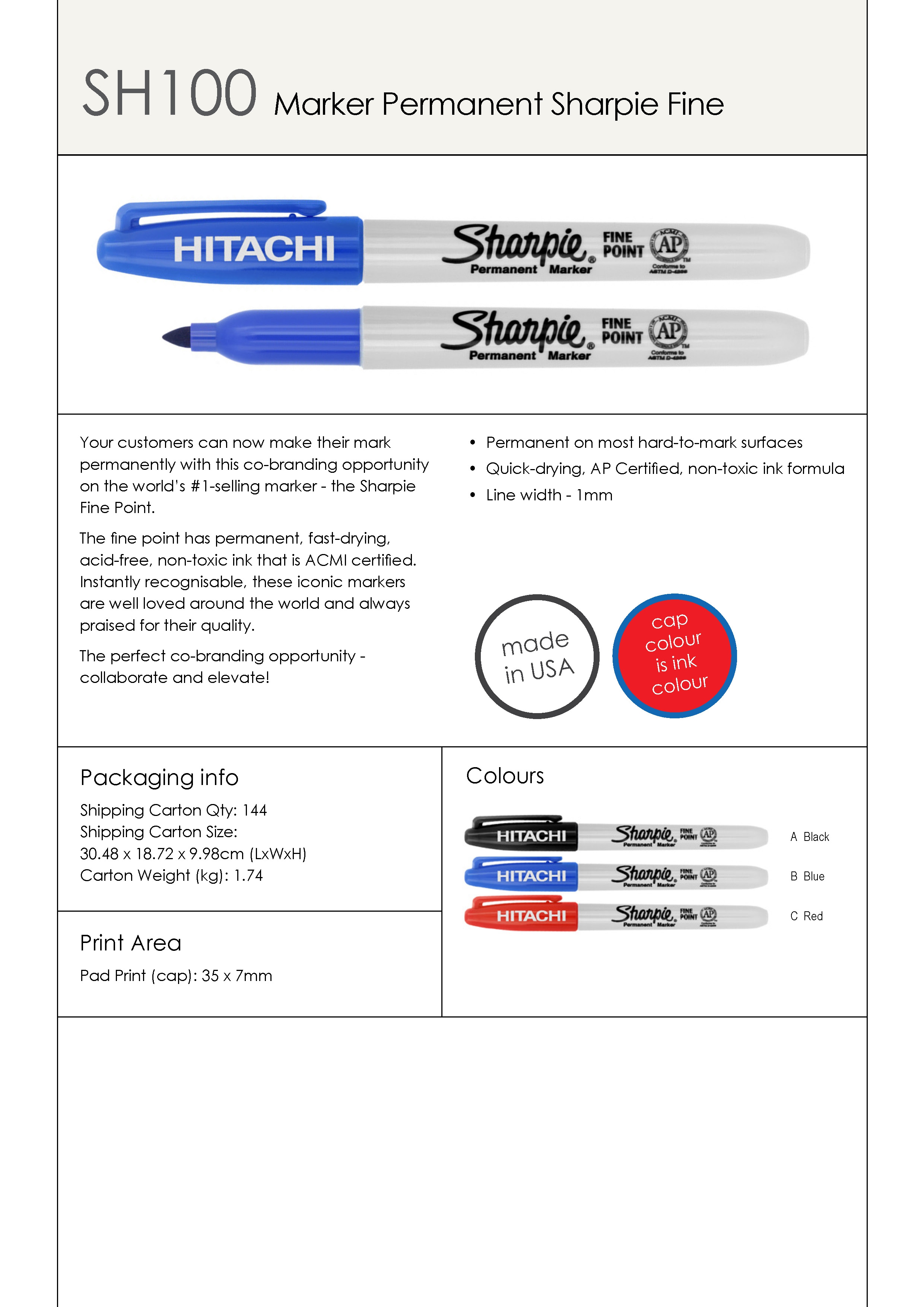 Your customers can now make their mark permanently with this co-branding opportunity on the world's #1-selling marker - the Sharpie Fine Point. The fine point has permanent, fast-drying, acid-free, non-toxic ink that is ACMI certified. Instantly recognisable, these iconic markers are well loved around the world and always praised for their quality. The perfect co-branding opportunity - collaborate and elevate! Note: Ink colour is same as cap colour.