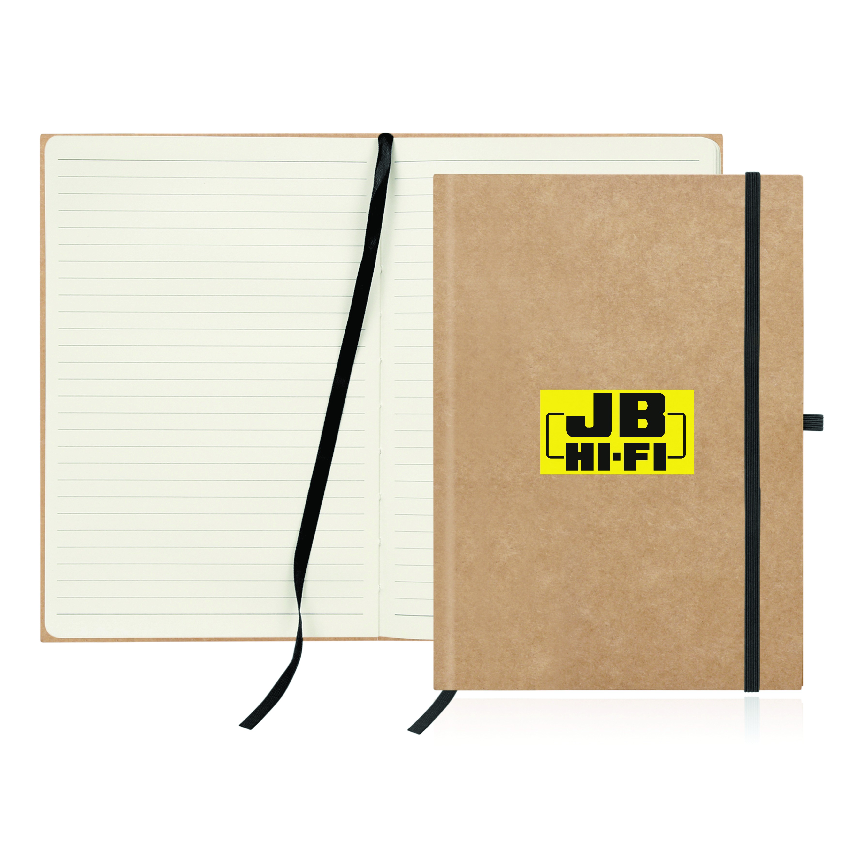 Size: 145mmW x 210mmH Recycled cardboard cover Lined pages Back cover and every page has a recycle logo 100% recycled paper Elastic band and Pen loop to match coloured strip