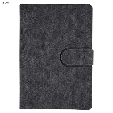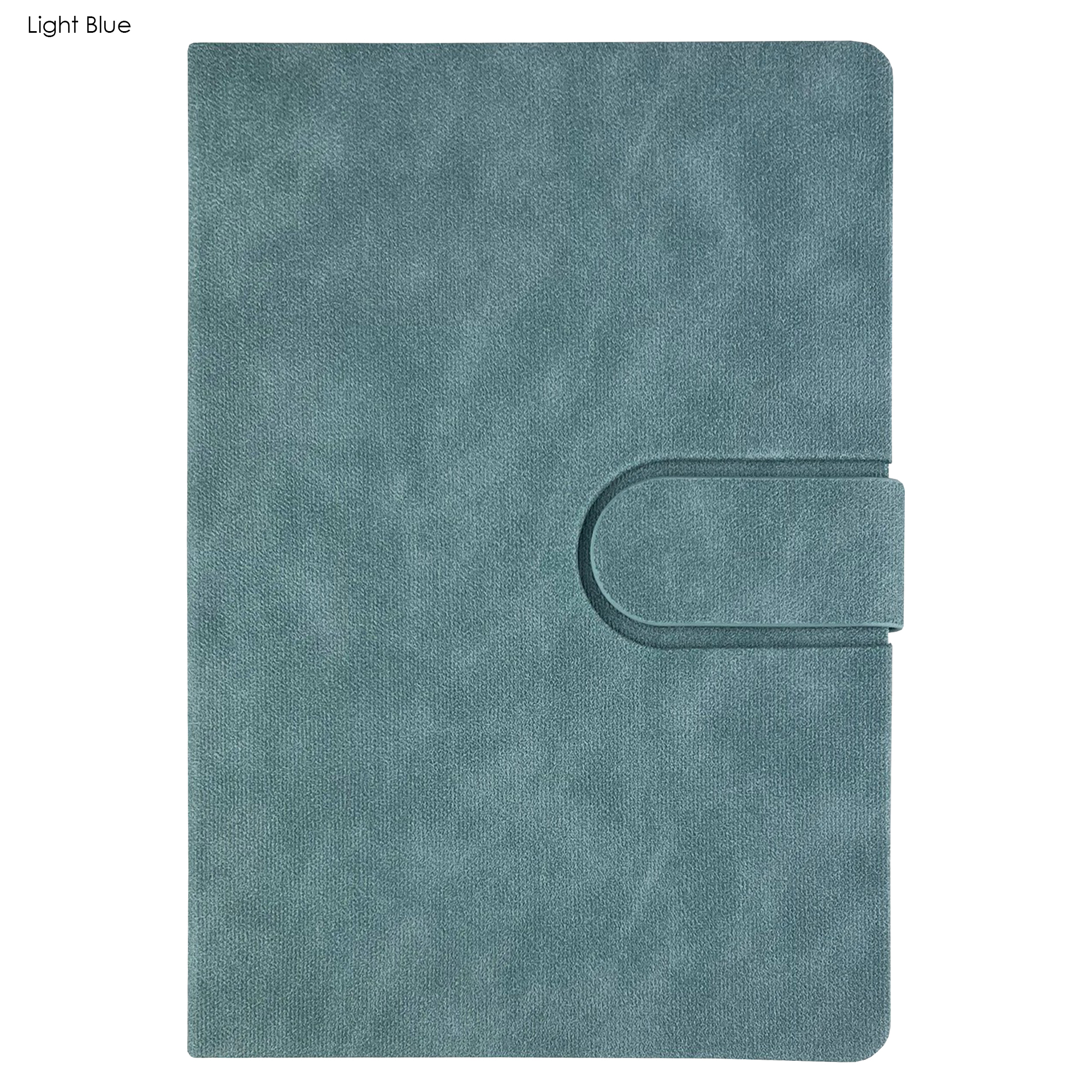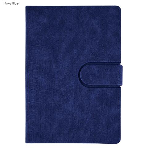 Modern design A5 notebook with hard PU leather cover with magnetic flip closure. 80 leaves (160 pages) of 80gsm lined off-white pages and matching colour fabric bookmark.