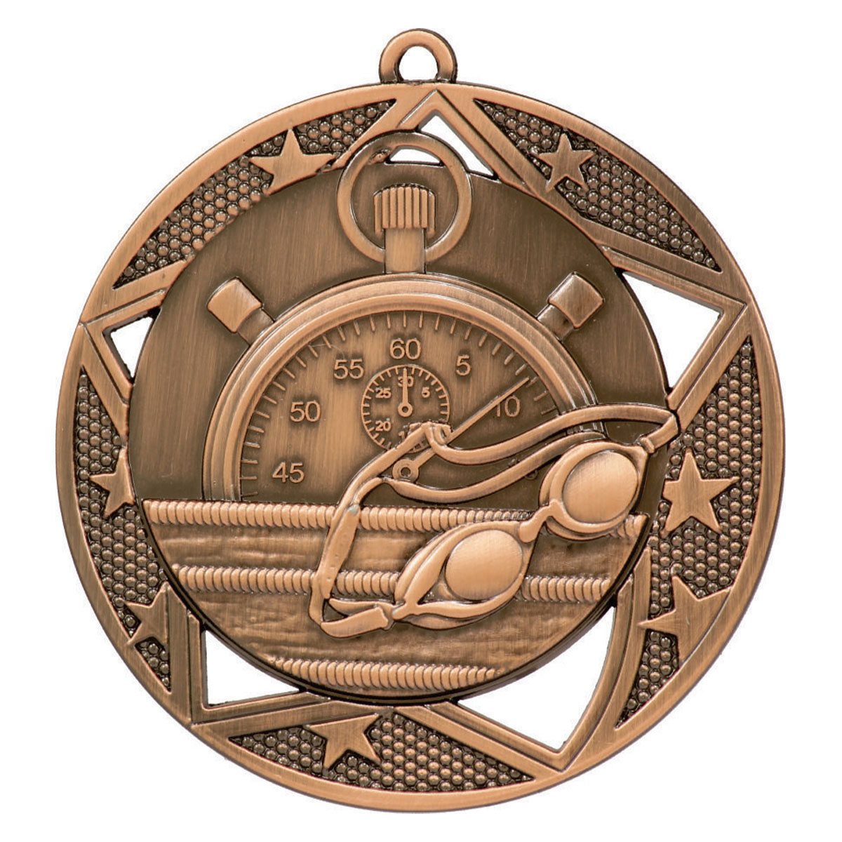 Galaxy Medals present a larger size of medal for Swimming events with effective star design and is suitable for budget requirements. Available in gold, silver and bronze and ribbons and medal boxes to suit.