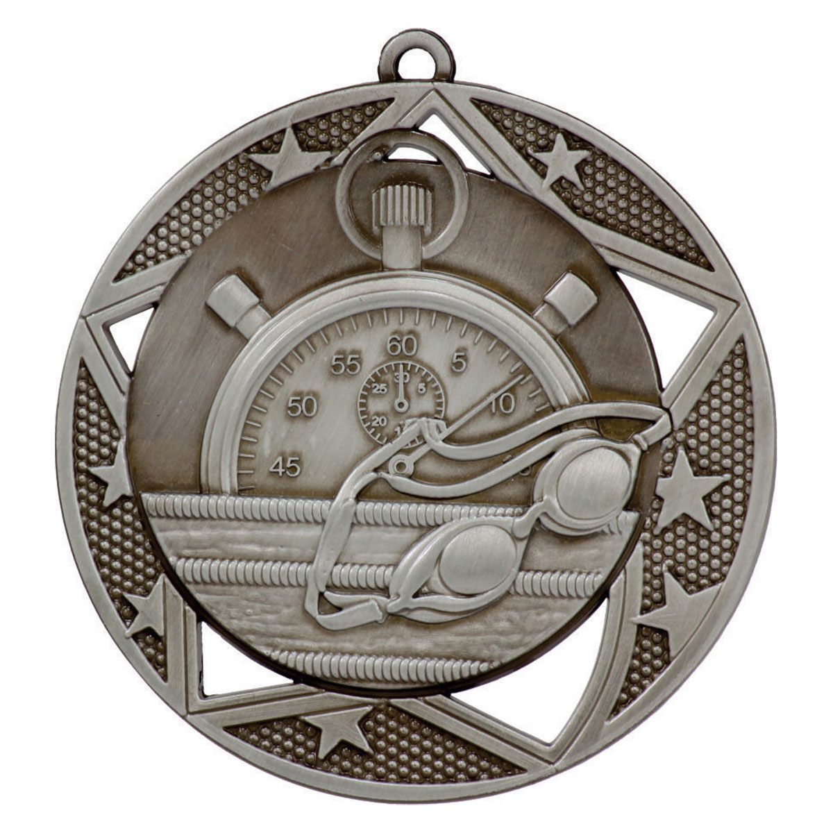 Galaxy Medals present a larger size of medal for Swimming events with effective star design and is suitable for budget requirements. Available in gold, silver and bronze and ribbons and medal boxes to suit.