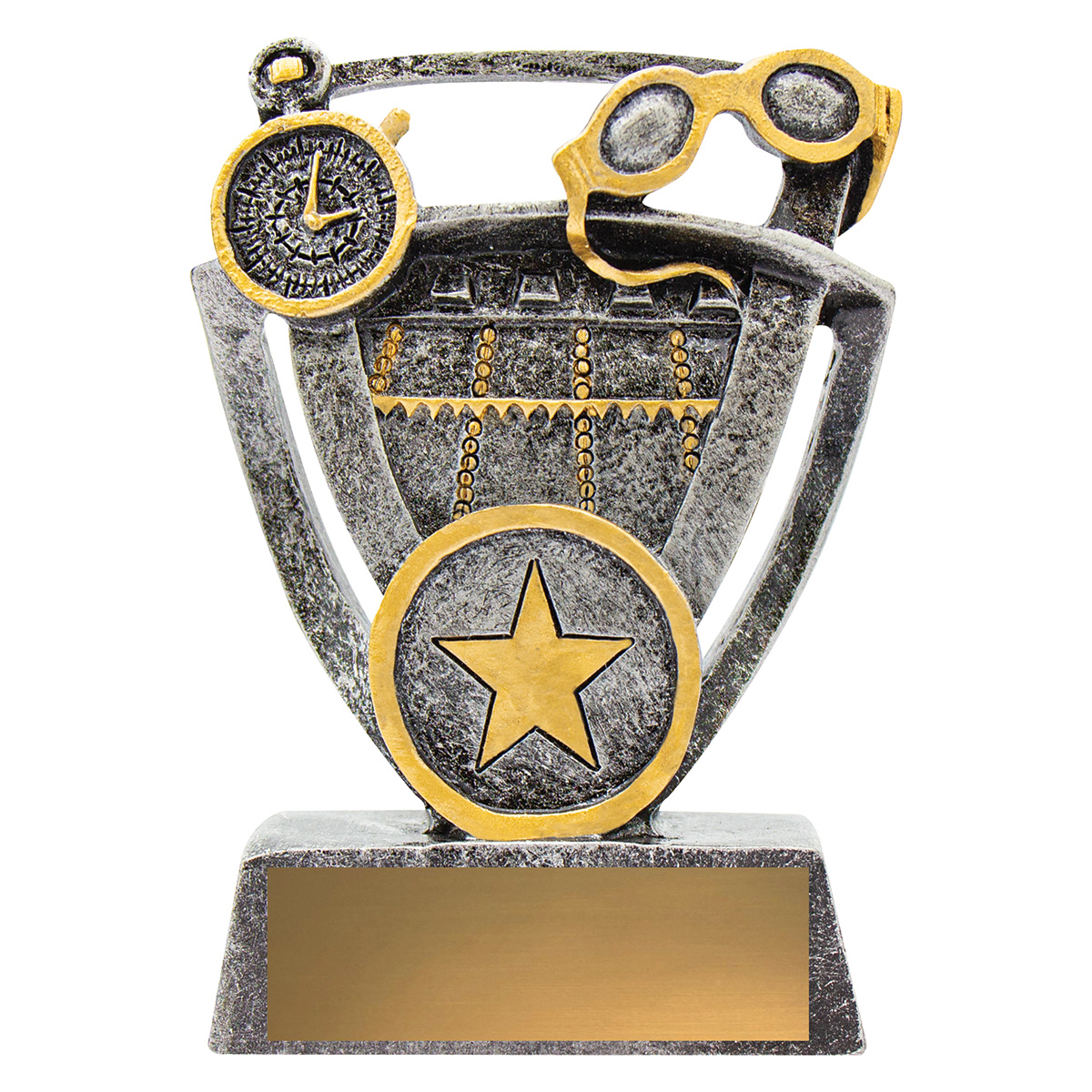 Swimming trophies in antique silver and gold offer excellent value over various sizes. Generic theme award with the option for customisation.