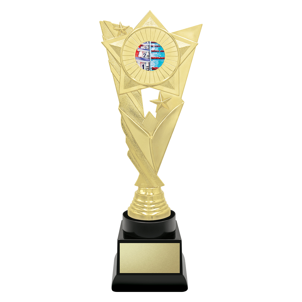 Star inspired trophies showcase iconic swim theme over a number of sizes. Trophy series finished in bright gold and offer great value for your event or competition.