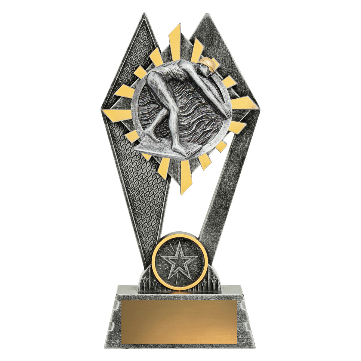 The Peak Series is an innovative trophy series offering super value for such an impressive size range. An elevated design that showcases a classic pose for swimming against a vibrant sunray background.