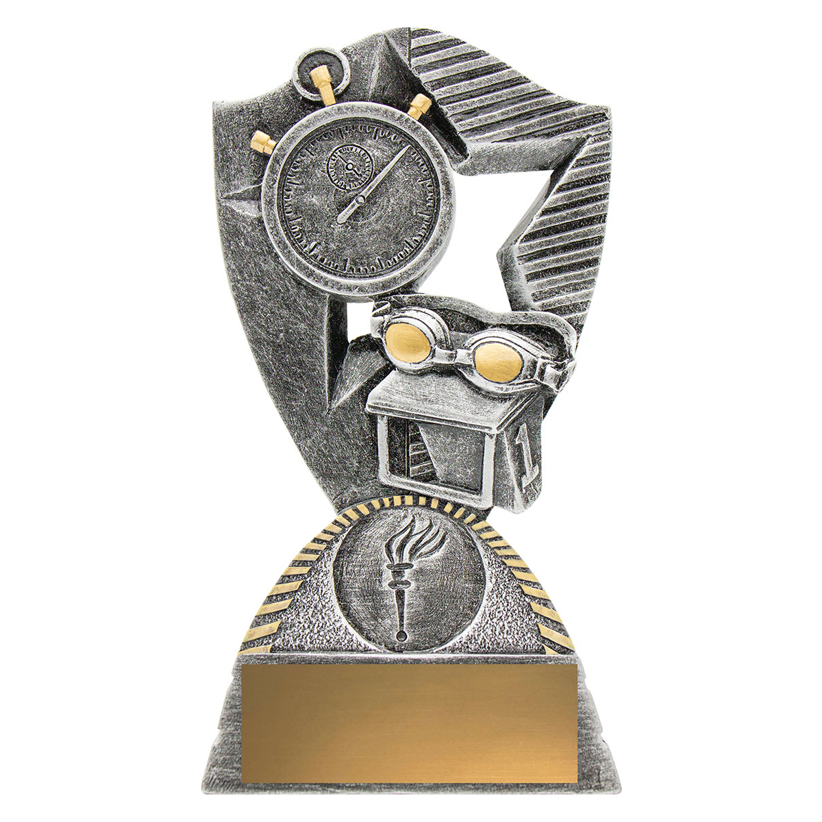 Brilliant Swim trophy features googles, stop-watch and diving block. Gambit offers a dynamic theme in antique silver & gold - space for your custom logo.