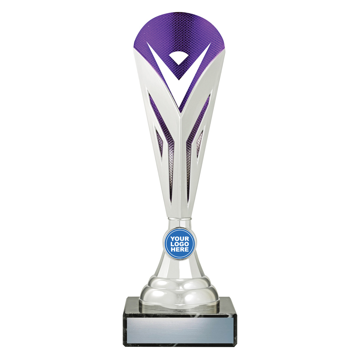 Brilliant Purple & Silver trophies with innovative cup design perfect for your special award winners. Cups available in 3 great sizes and feature modern design and different textures. Black marble bases provide extra prestige.