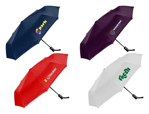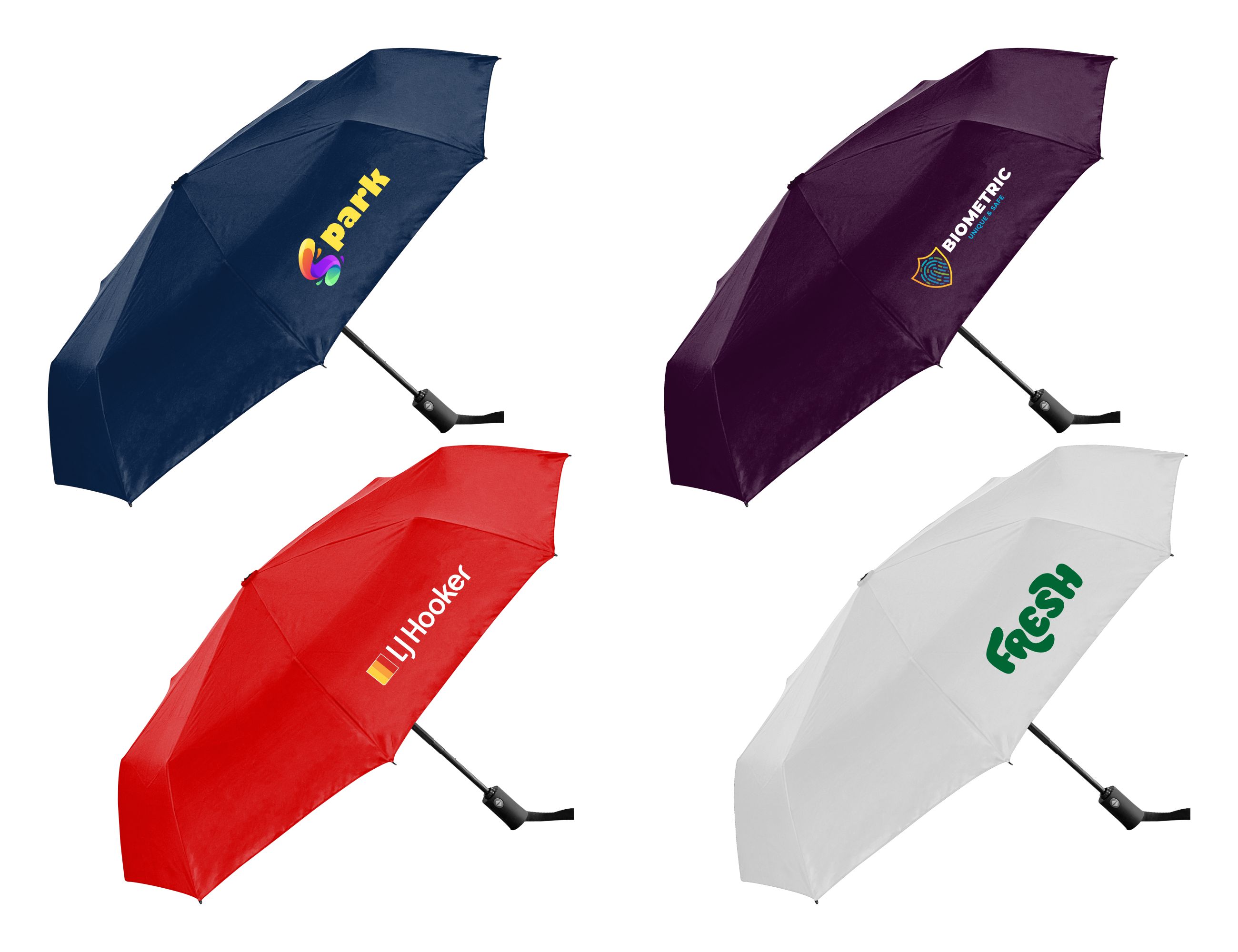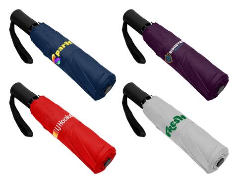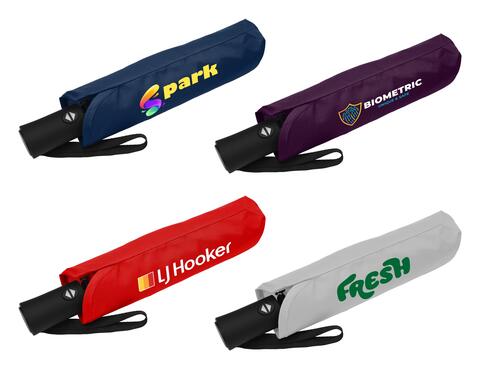 Stylish, durable, and designed for all-weather performance, the Como Fold-Up Umbrella is a premium compact umbrella ideal for everyday use and offers unequaled brand exposure. Available in 8 popular stock colours, this umbrella features a smooth automatic open and close function for quick convenience. Built to withstand the elements, the canopy is engineered to invert in strong winds, helping to protect the internal frame from damage. Its sturdy construction includes 8 panels supported by a combination of fibreglass and steel ribs, along with an electroplated steel shaft for added strength. Measuring just 28.5cm when folded, with a 55cm rib length and a generous 110cm open canopy, it’s the perfect size for on-the-go coverage. Finished with a deluxe matt handle and wide carry strap, and packaged in a matching pouch, the Como also offers multiple branding options – your logo can be printed on the umbrella panels, the pouch, or elegantly featured on the wide closing strap for all to see even when the umbrella is closed. Made from premium grade 190T Pongee.
