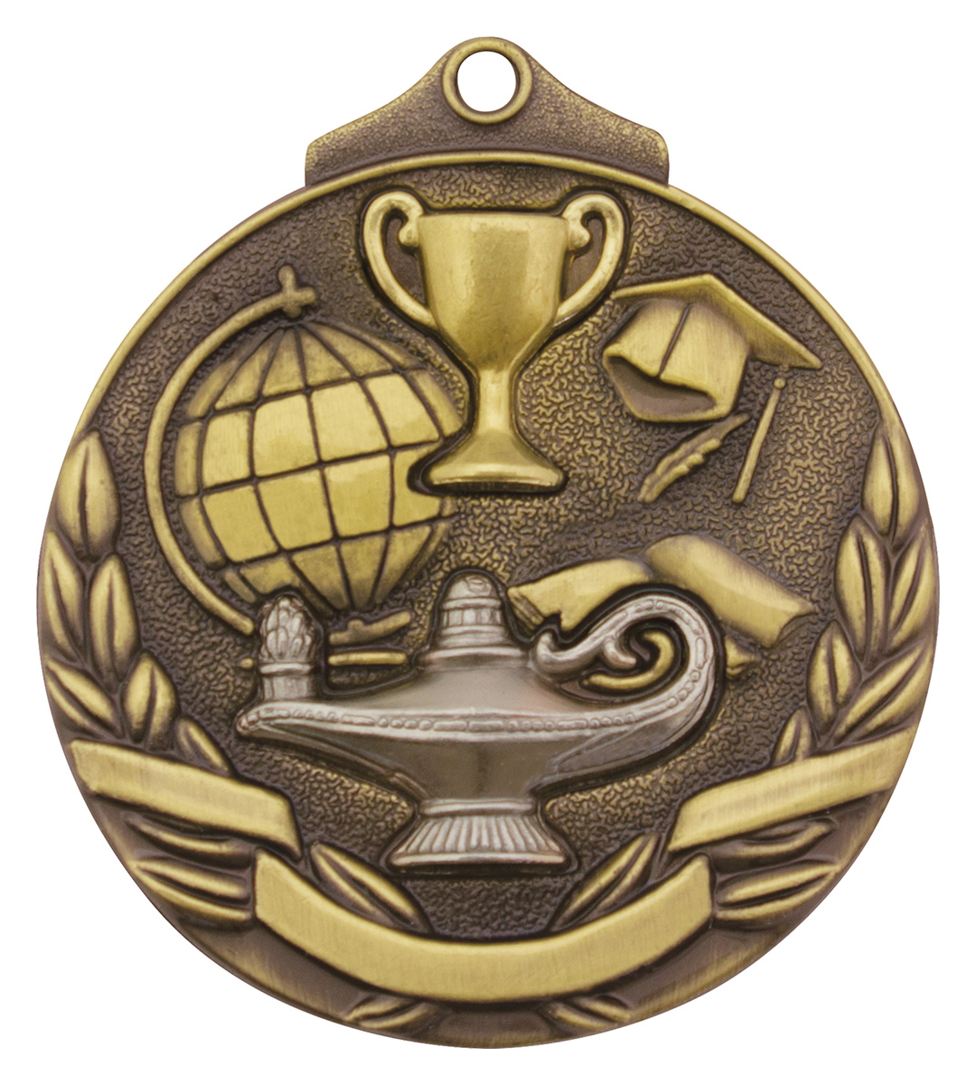 Classic antique medal featuring distinctive two-toned design. Medal a fantastic option to recognise academic achievement and the design features lamp of knowledge, graduation cap and globe. Ribbons available in all colours and medal boxes to suit.
