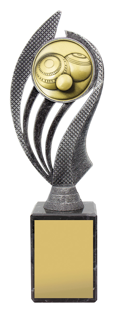 Husky series of trophies on premium black marble allows for different award options for your activity. Appealing antique silver and gold combination over number of sizes.