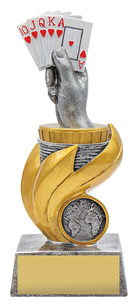 Flame trophy series is a popular and reliable choice featuring a dynamic design that celebrates your sport or activity. Cards Flame Trophy series highlights that perfect hand. Cards trophies available in 3 convenient sizes with the option of customisation.