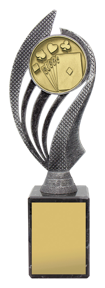 Husky series of trophies on premium black marble allows for different award options for your activity. Appealing antique silver and gold combination over number of sizes.