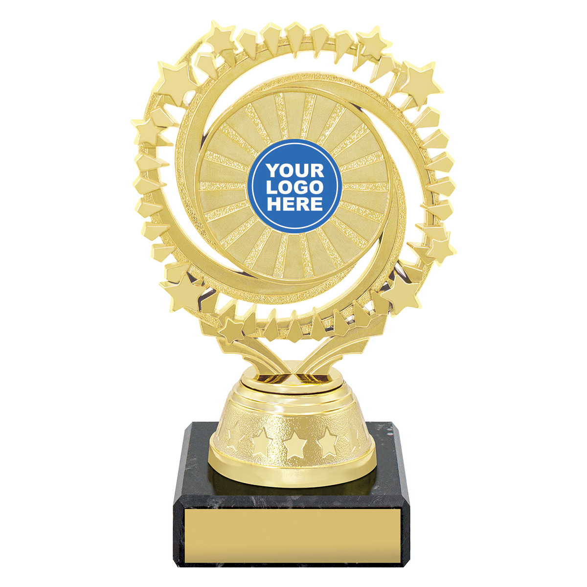 Cosmic series of affordable trophies feature star spangled holder in gold or silver - choose colour of column to suit your order. Suit 25 or 50mm centre insert.