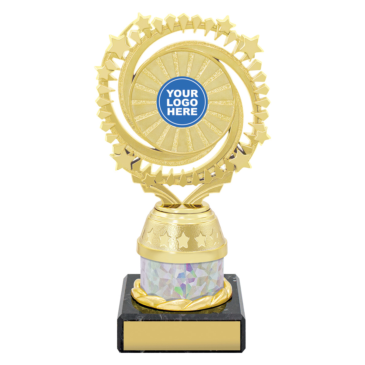 Cosmic series of affordable trophies feature star spangled holder in gold or silver - choose colour of column to suit your order. Suit 25 or 50mm centre insert.