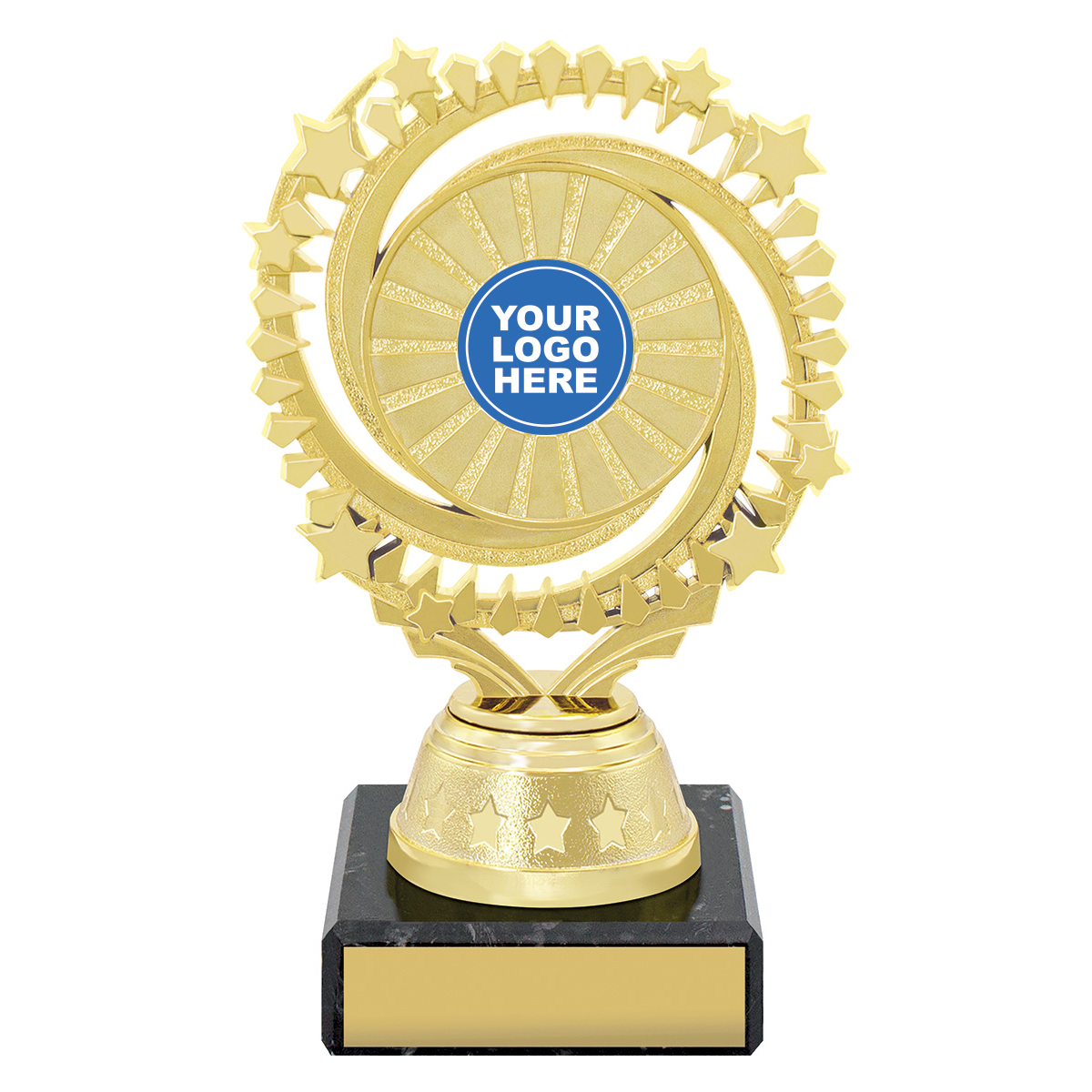 Cosmic series of affordable trophies feature star spangled holder in gold or silver - choose colour of column to suit your order. Suit 25 or 50mm centre insert.