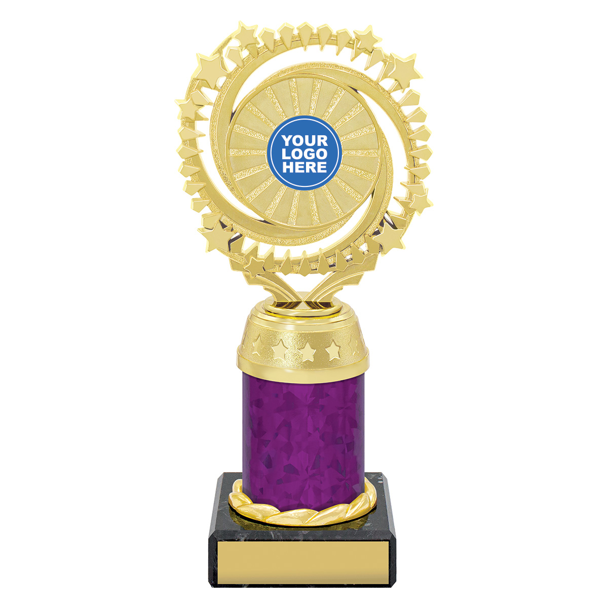 Cosmic series of affordable trophies feature star spangled holder in gold or silver - choose colour of column to suit your order. Suit 25 or 50mm centre insert.