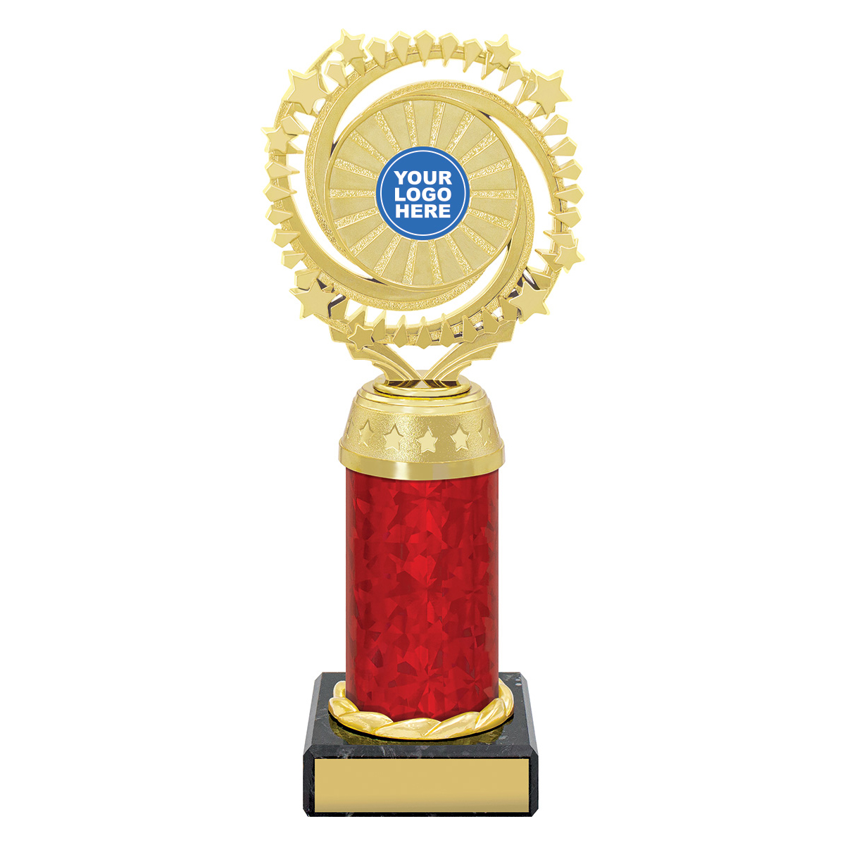 Cosmic series of affordable trophies feature star spangled holder in gold or silver - choose colour of column to suit your order. Suit 25 or 50mm centre insert.