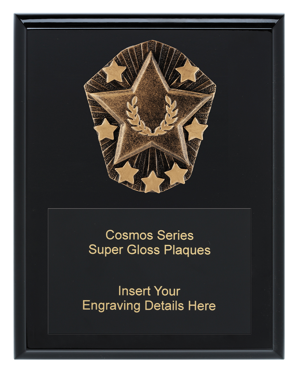 Range of super gloss plaques in classic black with brilliant Cosmos fronts and matte black engraving. Choose plaque - available in 3 sizes - to suit your sport or activity.