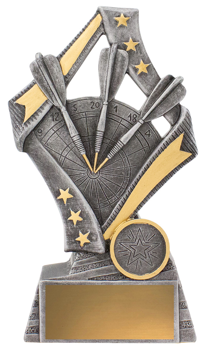 Dynamic darts trophies ideal for all participants at your event. These 'Flag' darts trophies feature a stylish star based design with iconic dart & board elements.