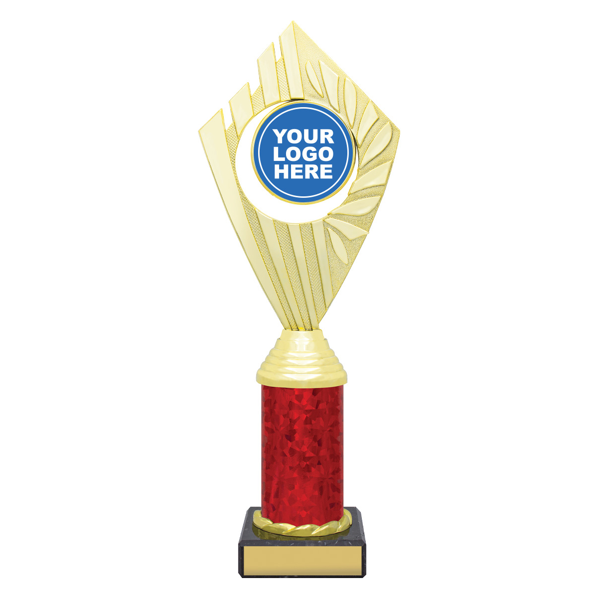Flyer Series of trophies feature beautifully designed holders on columns of different colours - option to showcase 25 or 50mm logo or insert.