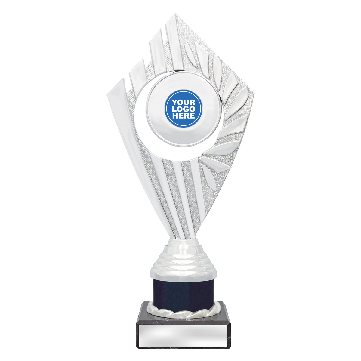 Flyer Series of trophies feature beautifully designed holders on columns of different colours - option to showcase 25 or 50mm logo or insert.