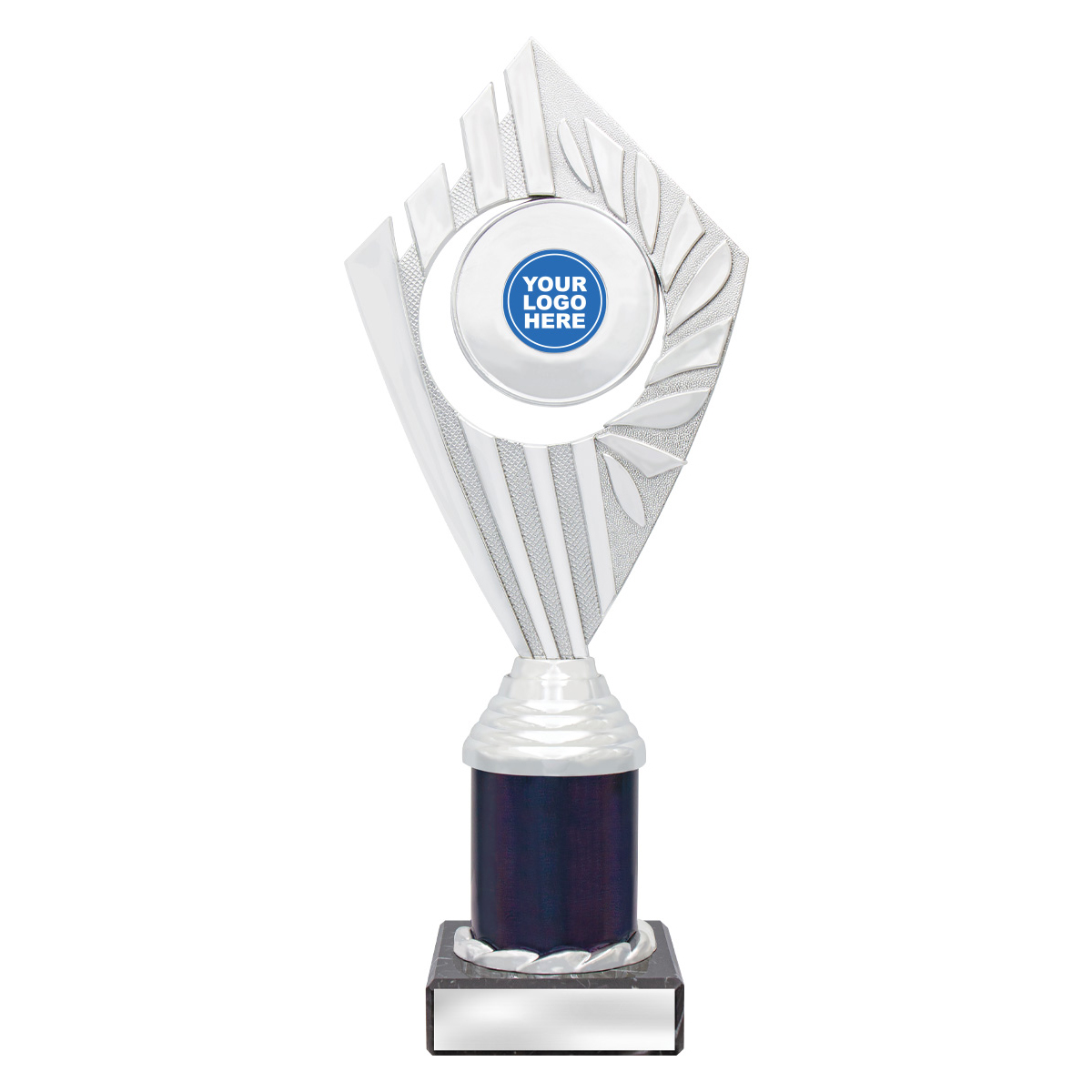Flyer Series of trophies feature beautifully designed holders on columns of different colours - option to showcase 25 or 50mm logo or insert.