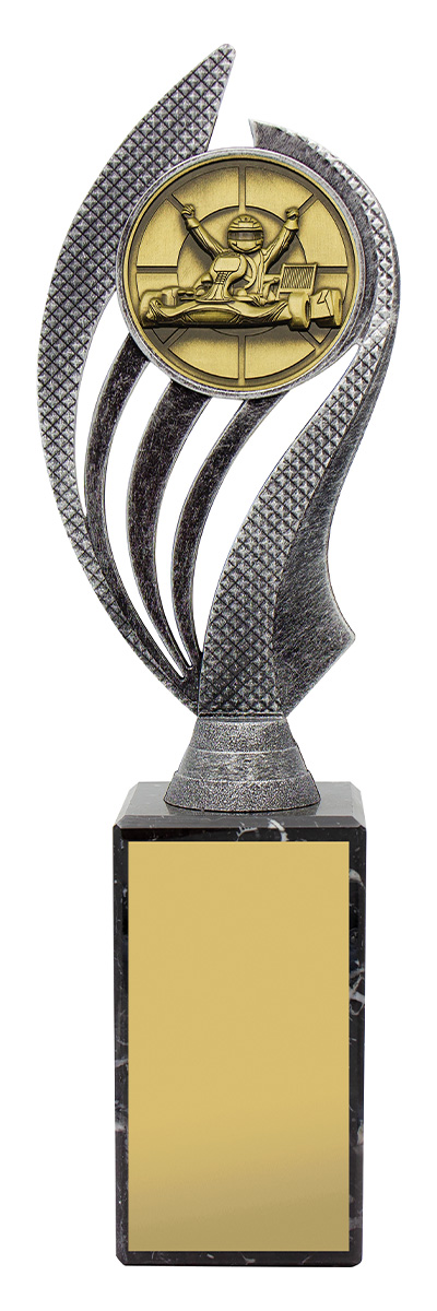 Husky series of trophies on premium black marble allows for different award options for your activity. Appealing antique silver and gold combination over number of sizes.