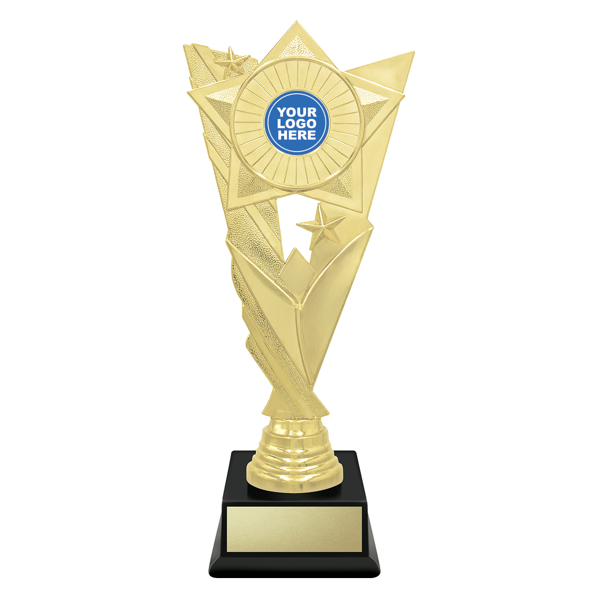 Star inspired trophies showcase your custom logo over a number of sizes. Trophy series finished in bright gold and offer great value for your event or competition.