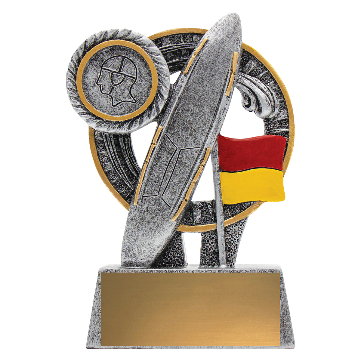 Splendid theme trophy for lifesaving events features board and flag with space for your logo. Series of sizes finished in classic antique silver & gold.