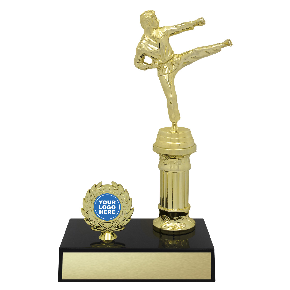 Pair of attractive multi part trophies that may be suitable for your event or competition. Excellent space for a custom logo. Select a top for your sport or activity.