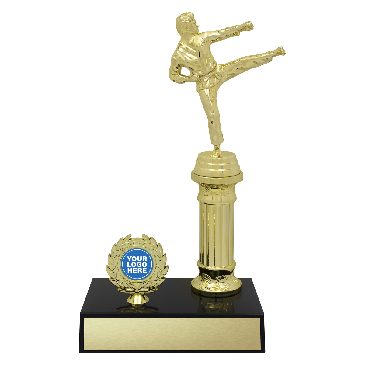 Pair of attractive multi part trophies that may be suitable for your event or competition. Excellent space for a custom logo. Select a top for your sport or activity.
