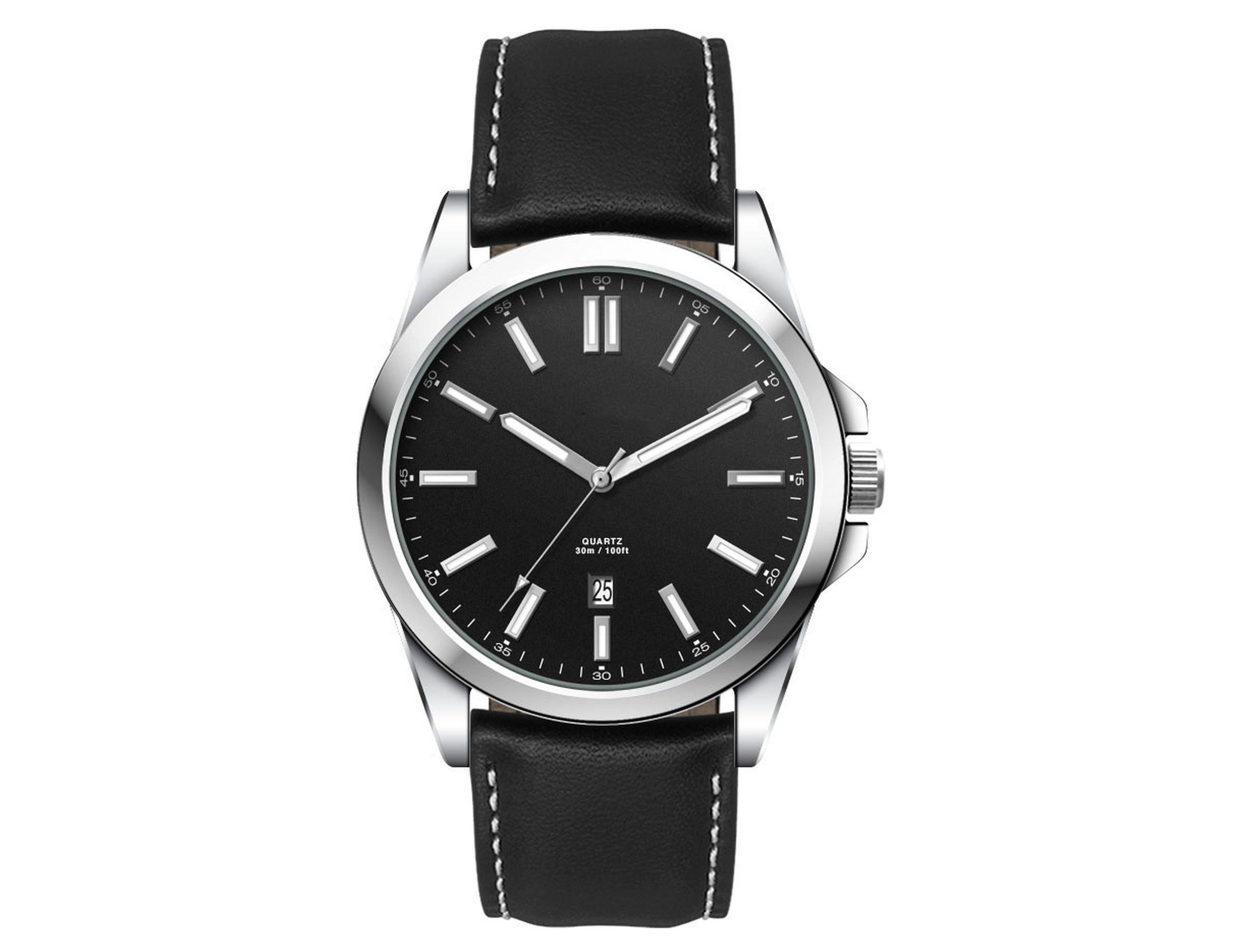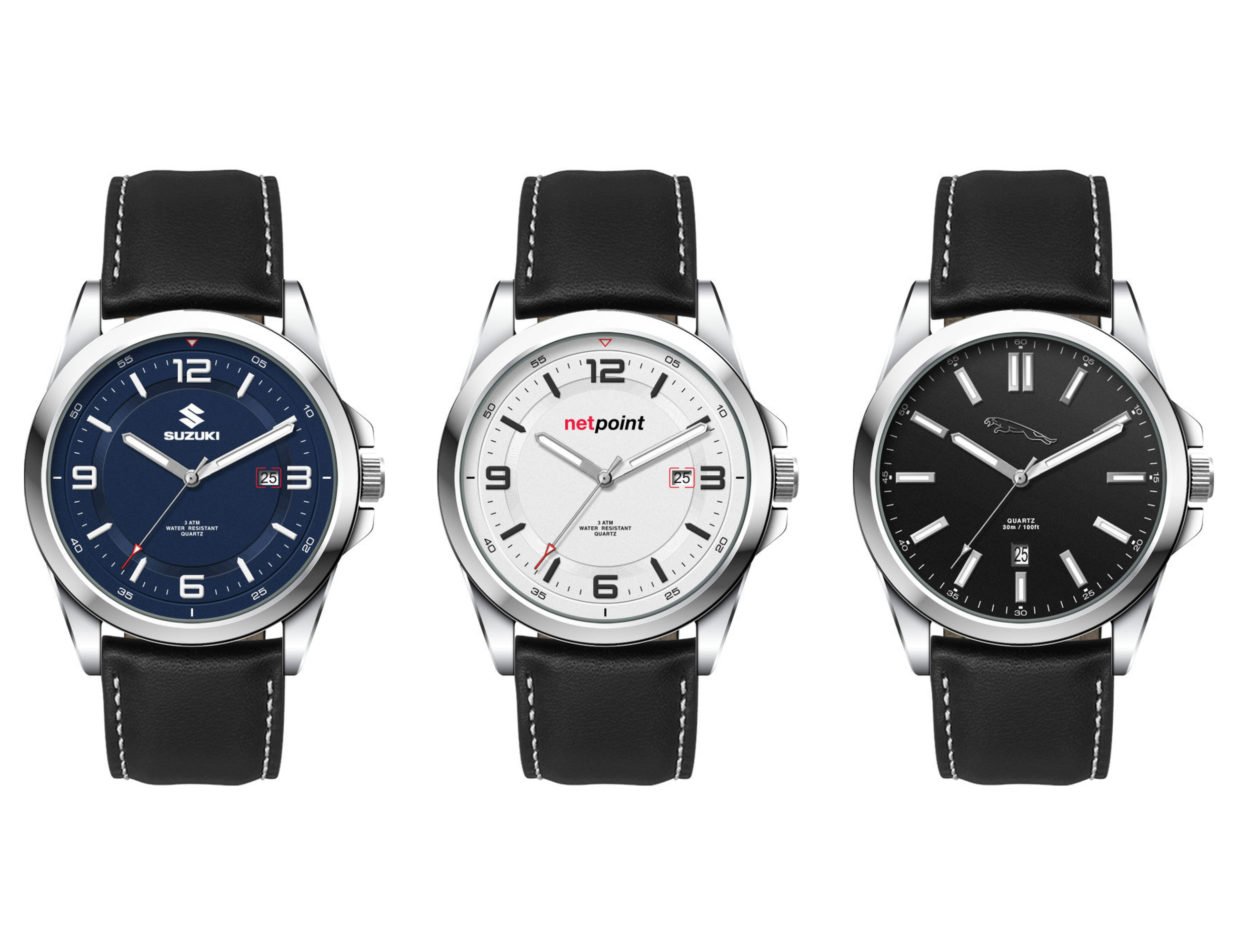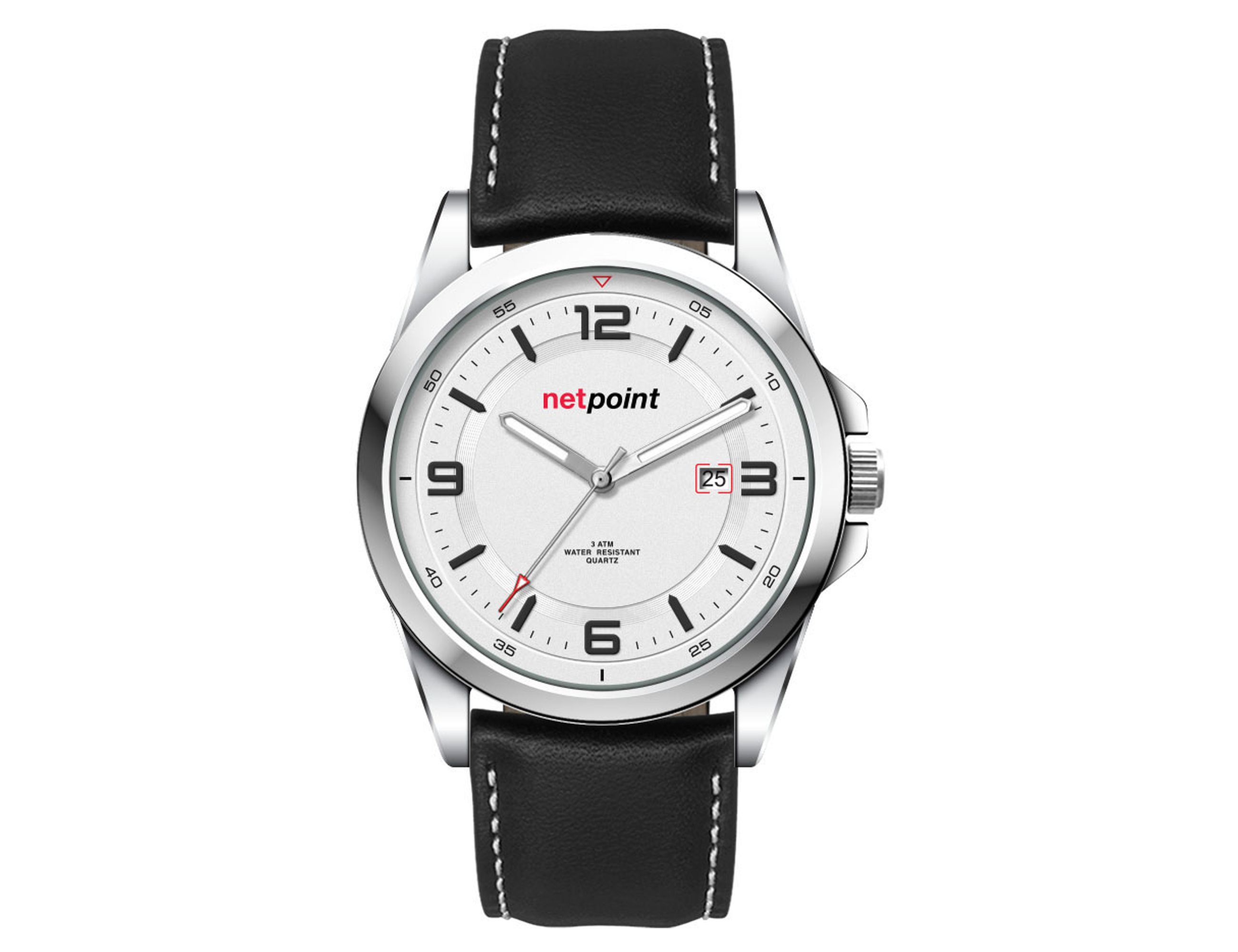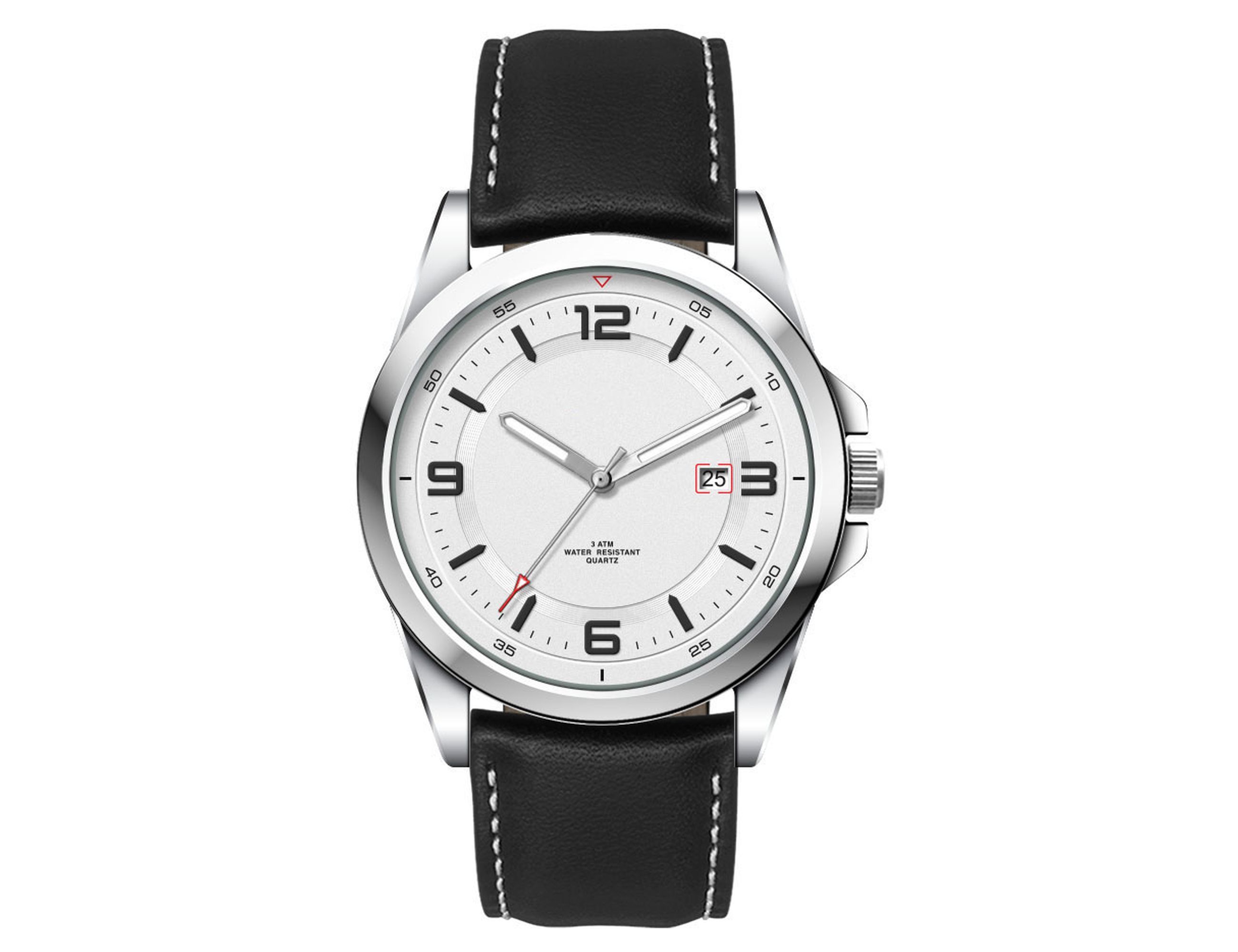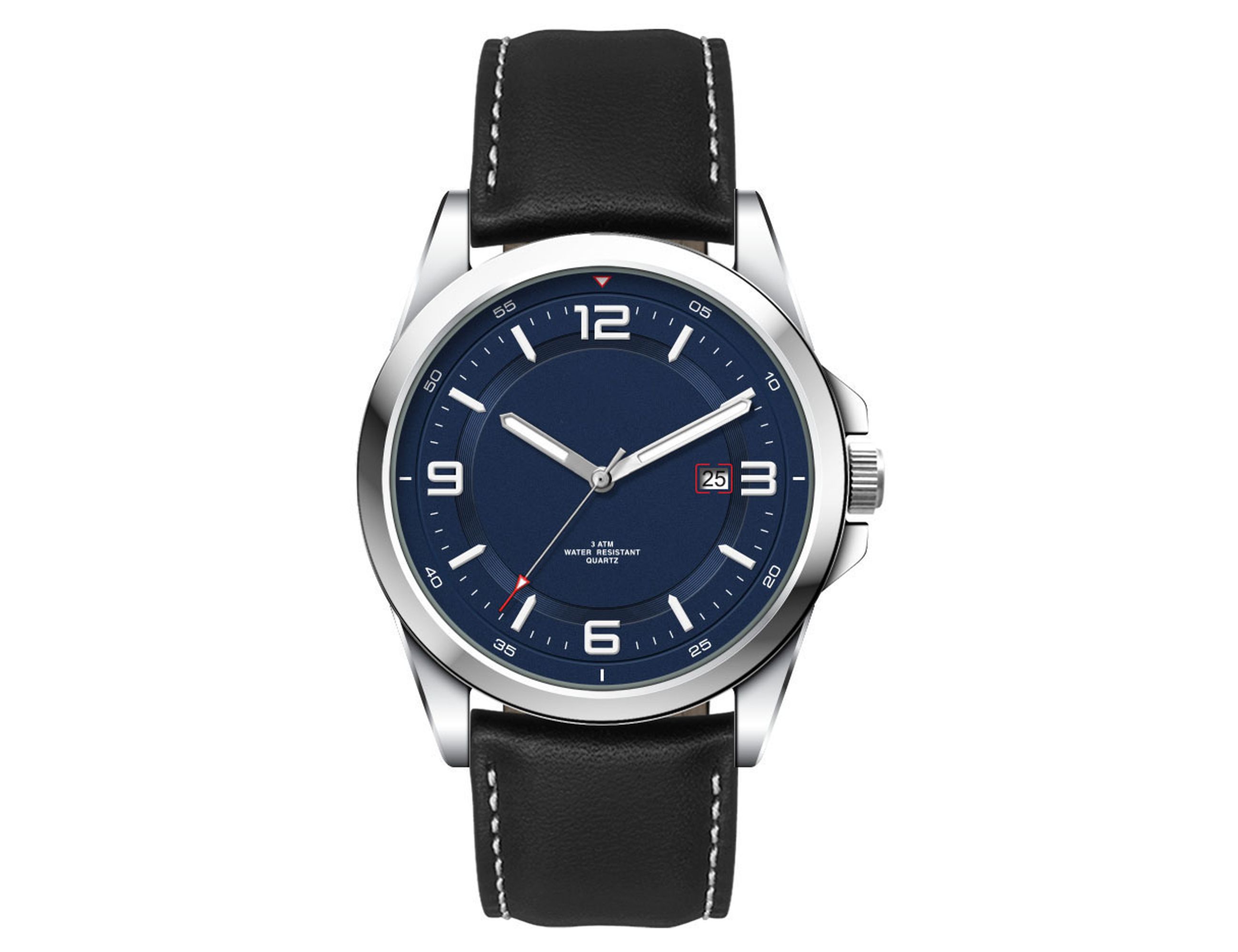 This quality casual unisex watch features an Ionic steel plated alloy case, padded black natural leather strap with white stitching, date function and is water resistant to 3 atm’s. This watch is avaiable with the choice of sunray black dial, matt white dial or matt blue dial.