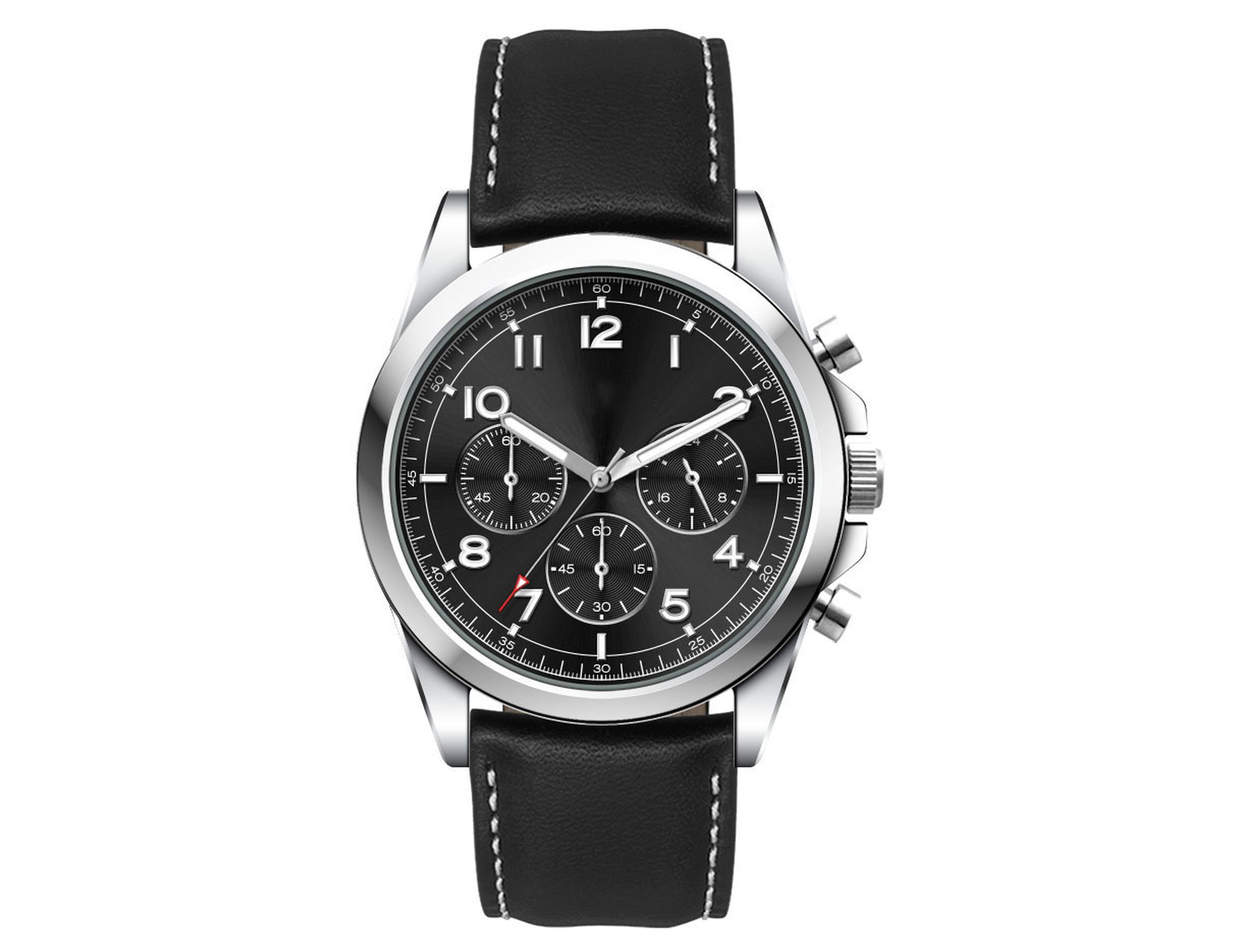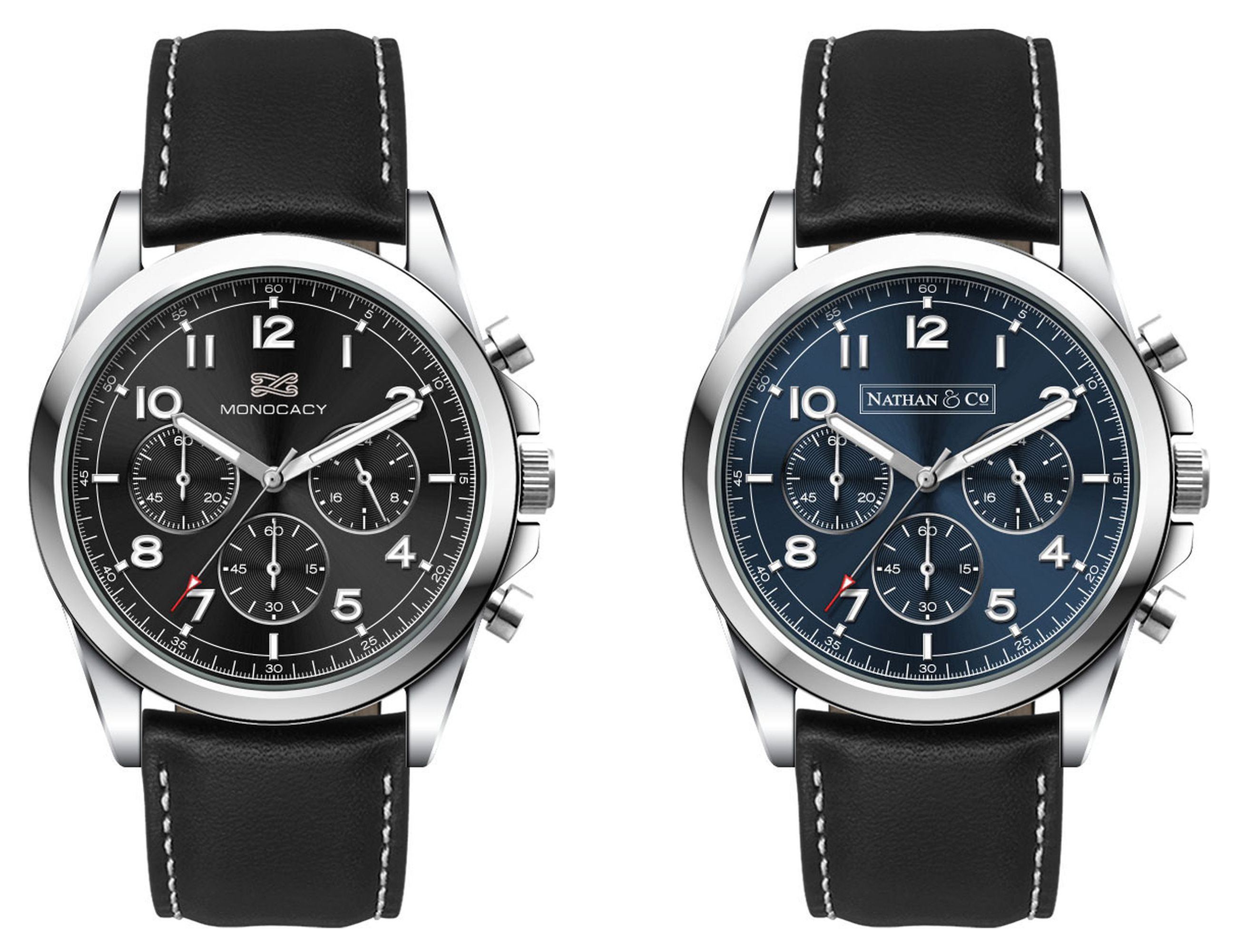 This quality chrono unisex watch features an Ionic steel plated alloy case, padded black natural leather strap with white stitching, Seiko VD54 chrono movement and is water resistant to 3 atm’s. This watch is avaiable with the choice of black or blue sunray dials.