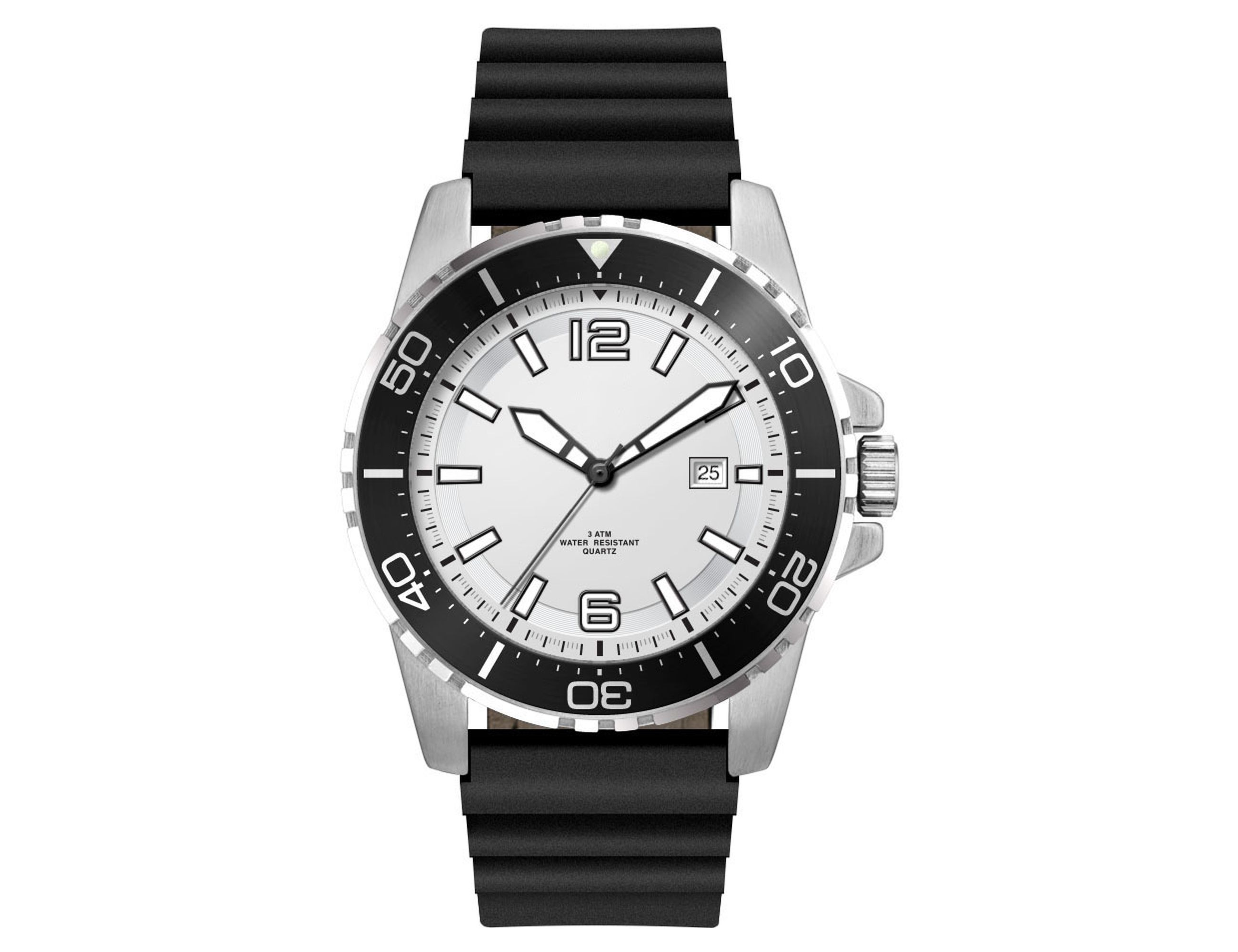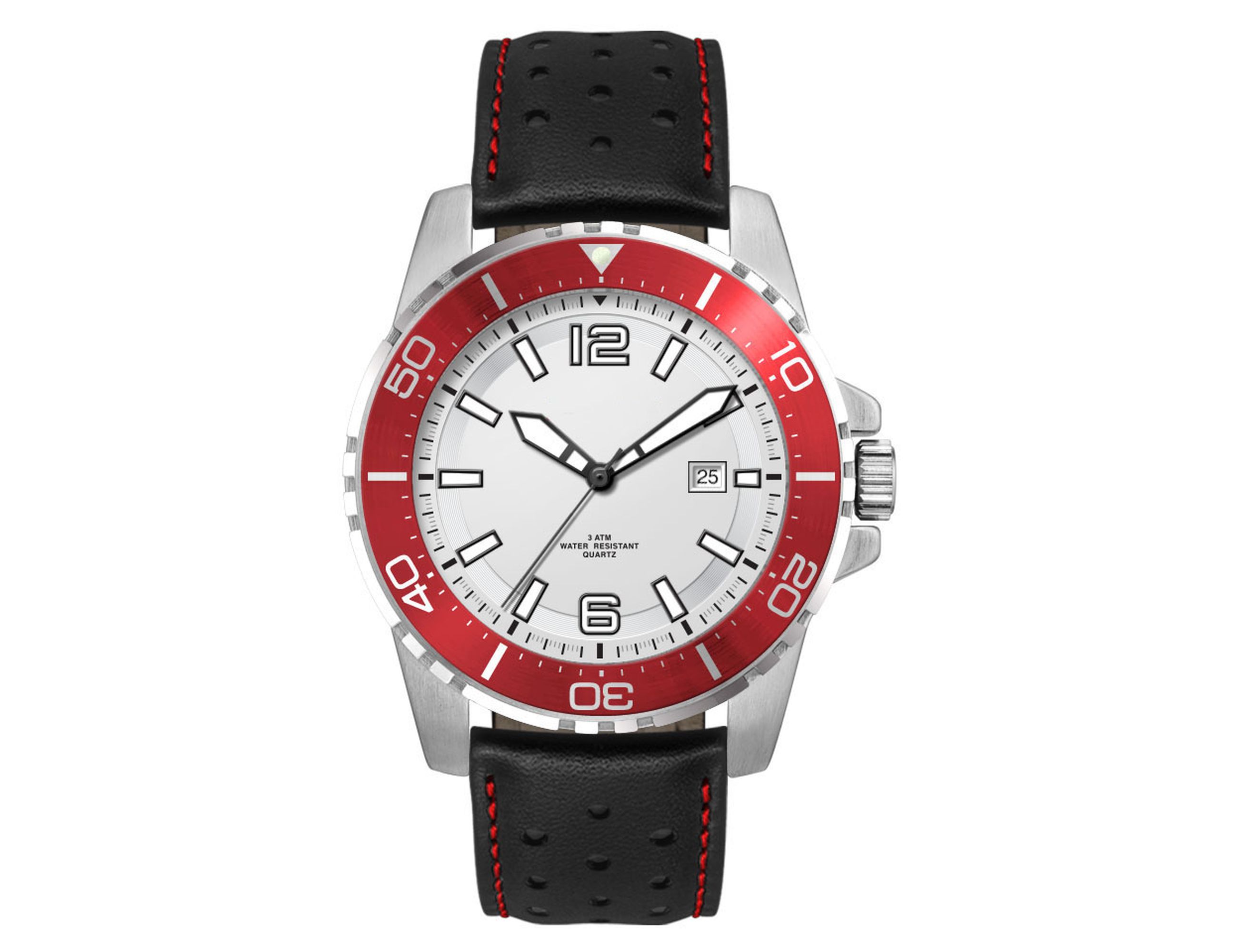 This quality sports watch features an Ionic steel plated alloy case with red, blue or black aluminium turning bezel and matt white dial. It also includes a date function and is water resistant to 3 atm’s. Select either a padded black natural leather strap with white or red stitching or a black silicone strap.